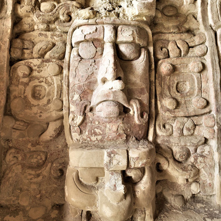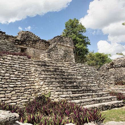 KOHUNLICH. Este sitio comprende complejos habitacionales y ceremoniales. Su monumento más emblemático es el Templo de los Mascarones, decorado con ocho mascarones de estuco pintados con policromías rojas y negras.